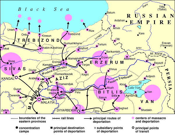 Solitamente, i turchi organizzavano le deportazioni di massa trasferendo i loro prigionieri in località piuttosto remote. Una delle destinazioni prescelte fu la desolata regione siriana di Deir al-Zor, dove centinaia di intere famiglie armene furono ammassate e lasciate morire di stenti. “Nel corso di queste frequenti ed estenuanti marce forzate – annotò il colonnello tedesco Hugo Stang –  le colonne armene venivano ripetutamente attaccate e depredate dai reparti curdi dei reparti Hamidye, una forza ausiliaria composta da un totale circa 30.000 criminali comuni arruolati dai turchi”.