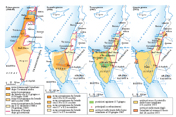 Guerre che si combatterono tra gli Arabi e gli Israeliani tra il 1948 e il 1973. La prima trovò la sua maggiore premessa nel rifiuto da parte araba di accettare la spartizione della Palestina decisa dalle Nazioni Unite con la risoluzione del 29 novembre 1947. Il giorno successivo la proclamazione d’indipendenza d’Israele (15 maggio 1948) gli eserciti di Egitto, Siria, Transgiordania, Iraq e Libano invasero il territorio dello Stato ebraico. Malgrado le ancora deboli strutture del proprio esercito, Israele respinse le forze nemiche e invase la penisola del Sinai. Si pose fine alle ostilità con la tregua del luglio 1948, che permise a Israele di incorporare nei propri confini la Galilea orientale, il Negev e una striscia di territorio fino a Gerusalemme, di cui occupò la metà. Seguì (1949) una serie di trattati di armistizio separati fra lo Stato ebraico e l’Egitto, il Libano, la Giordania e la Siria.