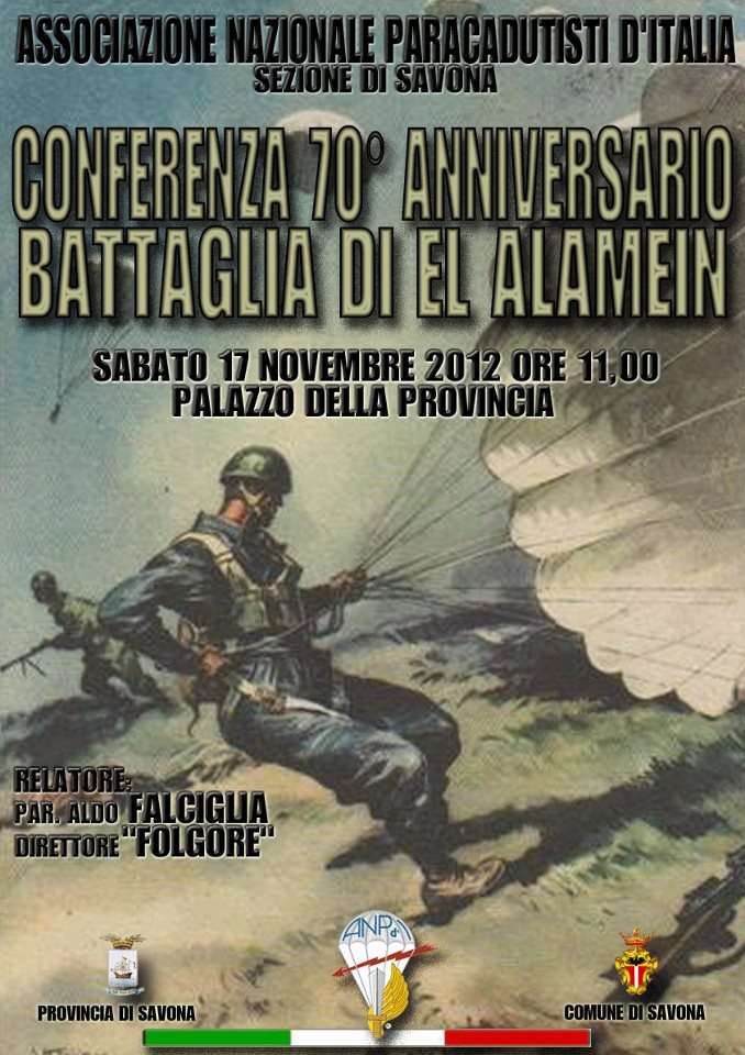 Eventi. ‘Conferenza 70° anniversario della Battaglia di El Alamein’. Sabato, 17 Novembre, ore 11, Palazzo della Provincia (Savona). 1 Novembre 2012 Alberto Eventi & Convegni 0 Convegno. Alberto RosselliBrigata FolgoreCarmelo FerlitoDepressione di QattaraDivisione FolgoreEl AlameinEnzo CiprianoFolgoriniFrattiniFukaGenovaGino SalviLaura VarvelliLigurpressLuciano GaribaldiMassimiliano AfieroMassimo MariottiMattioliMaurizio CabonaPaolo BozParacadutisti italianiPiero VassalloPisaPrima Guerra MondialePrimo SienaRoberto MaurielloSavonaSimone PoggioStoria VeritaTommaso Romano