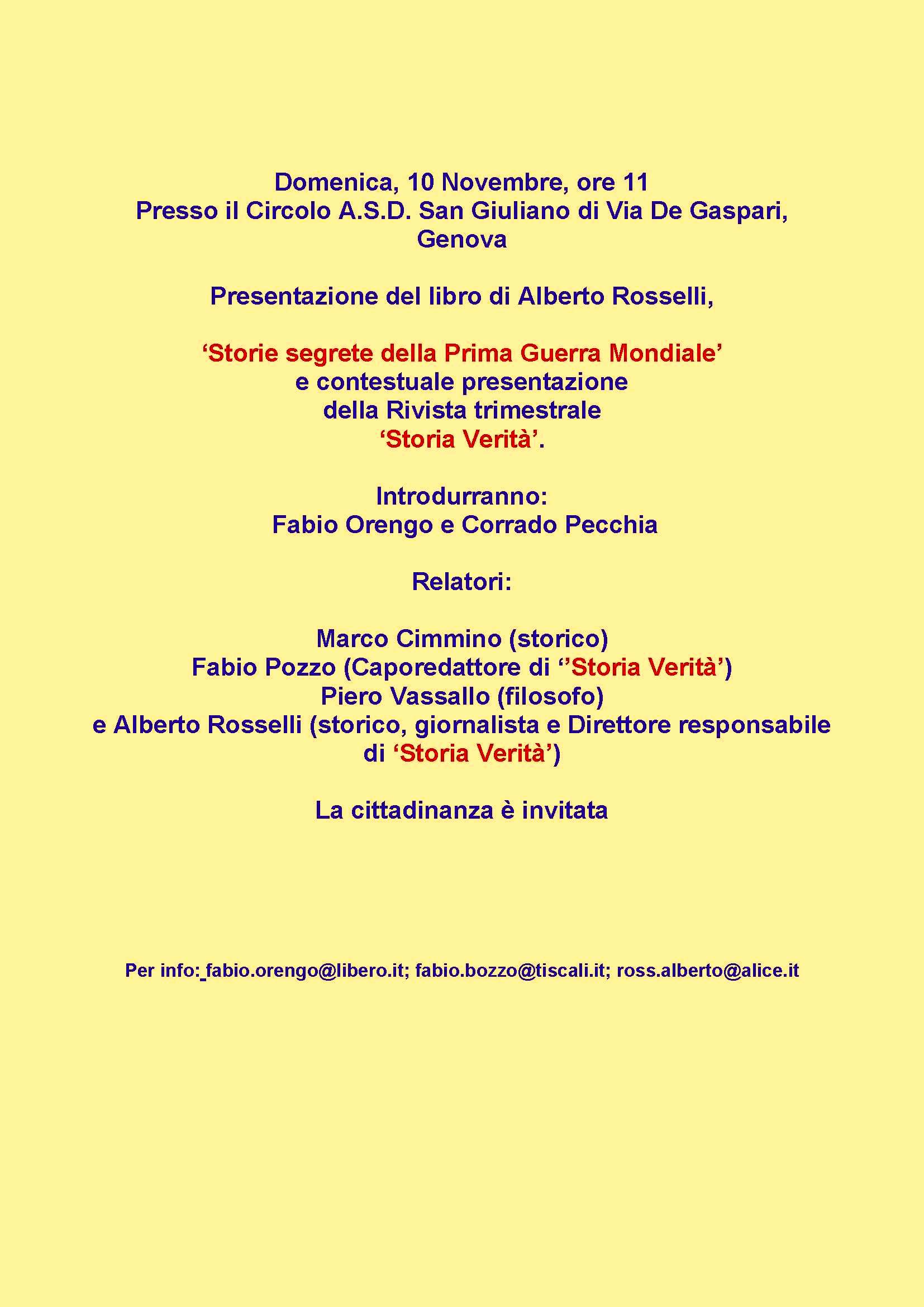 Appuntamenti culturali. Domenica 10 Novembre, ore 11, presso il Circolo A.S.D. San Giuliano (Via De Gaspari, Genova), presentazione del libro di Alberto Rosselli ‘Storie Segrete della Prima Guerra Mondiale’ e contestuale presentazione della Rivista ‘Storia Verità’.