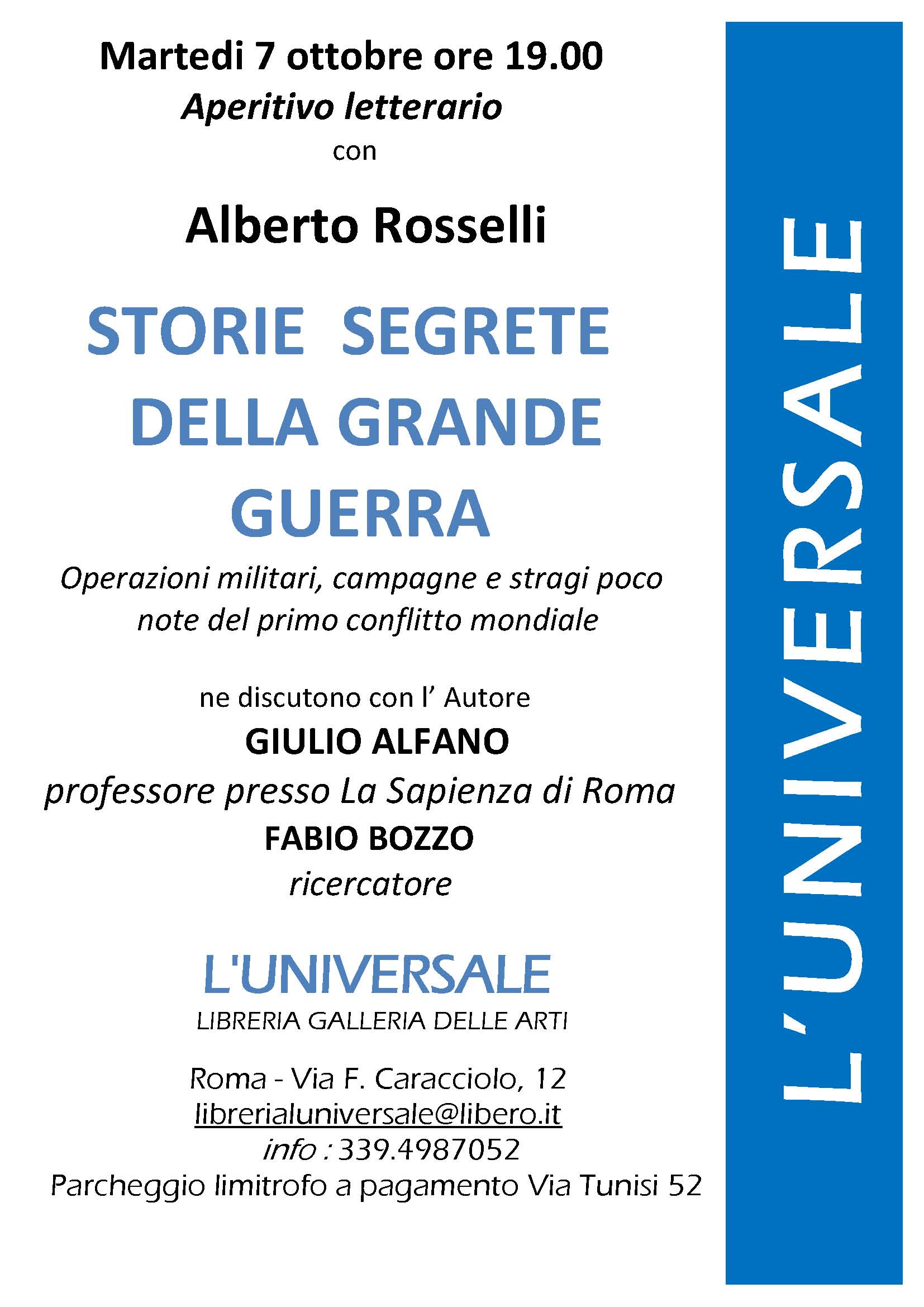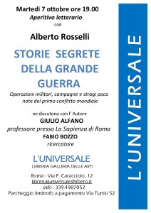 News. Martedì, 7 Ottobre, alle ore 19.00, presso la Libreria Galleria delle Arti L’Universale (Roma) Aperitivo letterario con Alberto Rosselli e presentazione del suo ultimo libro ‘Storie segrete della Grande Guerra’. 2 Ottobre 2014 Alberto Eventi & Convegni 0 Locandina/Invito. Acqui StoriaAlberto RosselliAlfio KrancicBebe RosselliCarlo SburlatiCarmelo FerlitoCesiCircolo Cattaneo ParmaCulturaEnzo CiprianoFabio BozzoGiuliano MarchettiGiulio AlfanoIl FoglioIl GiornaleL'UniversaleLa SapienzaLaura VarvelliLiberoLibreria Galleria delle Arti L'UniversaleLuciano GaribaldiMarcello VenezianiMarco CimminoMariano GabrieleMassimiliano AfieroMassimo MariottiMattioli editoreMaurizio CabonaMaurizio MessinaMonica IughettiNuova Aurora SASPaolo BozParmaPiero VassalloPrima Guerra MondialePrimo SienaRoberto De MatteiRoberto MaurielloRomaSeconda Guerra MondialeSettimo SigilloStoria VeritaSusanna CeccardiVia Caracciolo