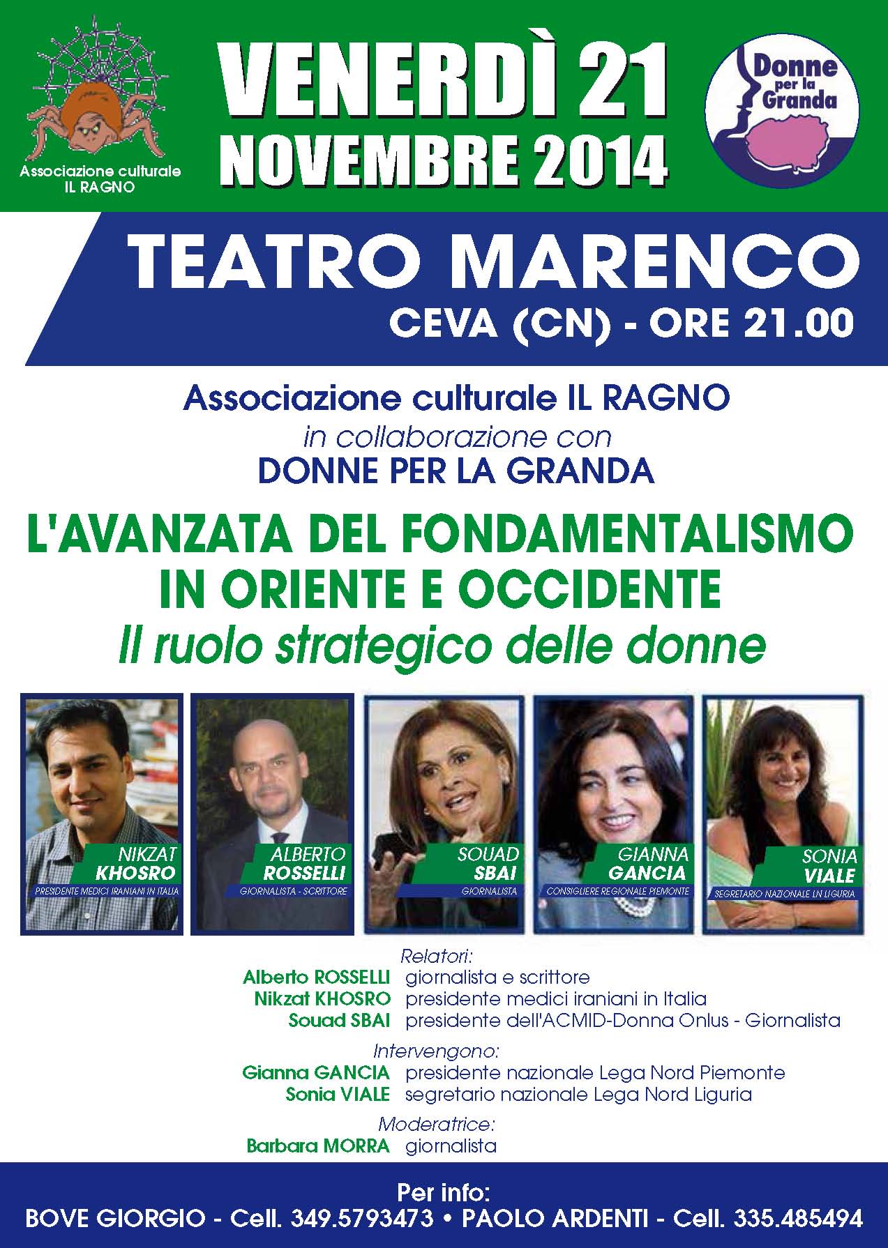 News: Conferenza. ‘L’avanzata del fondamentalismo in Oriente e Occidente – Il ruolo strategico delle Donne’. Teatro Marenco (Ceva), Venerdì 21 Novembre, ore 21. 8 Novembre 2014 Alberto Politologia, Politica, Economia, Geopolitica 0 Locandina Evento. Alberto RosselliAlfio KrancicArdentiAssociazione Culturale Il RagnoBelliniBordigheraCarmelo FerlitoCevaCoranoCristianesimocristianofobiaCuneoEdoardo RixiFirenzefondamentalismo islamicoFondazione LepantoGenovaGianna GanciaGino SalviIl FoglioIl GiornaleIl Secolo XIXinfibulazioneintolleranza islamicaIslamLa StampaLaura VarvelliLega Nord LericiLega Nord LiguriaLega Nord PiemonteLepantoLiberoLions BordigheraMarcello VenezianiMarco CimminoMassimo MariottiMatteo SalviniMonica IughettiMusulmaniNuova Aurora EditriceNUova Aurora SAS di Alberto RosselliOccidenteOrientePiero VassalloPrimo SienaRadici CristianeRoberto De MatteiRoberto MaurielloSavonaSettimo SigilloSonia VialeSouad SbaiStenio SolinasStoria VeritaTeatro MarencoTommaso RomanoTorino