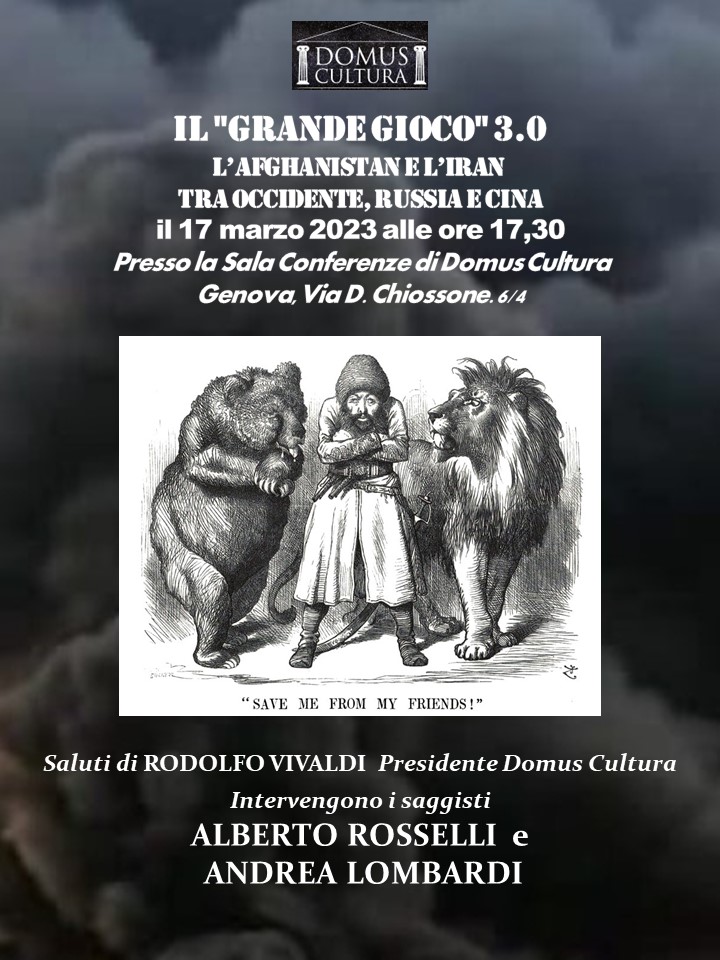 Appuntamenti culturali a Genova. I rapporti tra l’Afghanistan e i Paesi limitrofi. 24 Febbraio 2023 Alberto Eventi & Convegni 0 L’Afghanistan e i Paesi confinanti. La locandina dell’evento organizzato da Domus Cultura Genova. AfghanistanAlberto RosselliAlessandra LancellottiAlexandra GalarzaAndrea LombardiArianne GhersiCinaCultura a GenovaDiego PistacchiDomus culturaFabio BozzoIl GiornaleItalia StoricaLiberoMattioli 1885Mauro BuzzettiMiriam PastorinoMonica DebéNuovo ArengarioPakistanRussiaStoria Verita