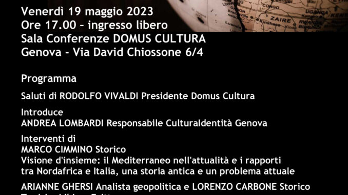 Appuntamenti culturali a Genova. La Redazione. 9 Maggio 2023 Alberto Eventi & Convegni 0 La locandina dell'evento. Alberto RosselliAlessandro PianaAndrea LombardiArianne GhersiBarbadilloClaudio EvaCultura IdentitàDomus culturaFabio BozzoGino SalviIl GiornaleLa VeritàLiberoLorenzo CarboneLorenzo GambinoLuciano GaribaldiMarco CimminoMaurizio GregoriniMiriam PastorinoMonica IughettiNuovo ArengarioPaolo StrianoParabellumRoberto RoggeroRodolfo VivaldiSettimo SigilloSouad SbaiStoria VeritàStoria Verita