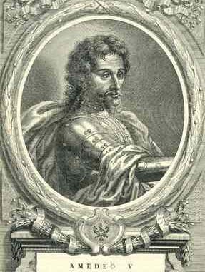 Amedeo V è il figlio cadetto di Tommaso II (morto nel 1259), conte di Maurienne e Savoia, e di Beatrice Fieschi, di nobile stirpe genovese e nipote di papa Innocenzo IV. La sua ascesa al potere fu difficile. In linea di principio Amedeo V è escluso dalla successione, perché Filippo I, conte di Savoia dal 1268, ed ex arcivescovo di Lione, non avendo figli, è il fratello maggiore di Amedeo, Tommaso, a dover succedere allo zio. Ecco il motivo per cui Amedeo fece un lungo soggiorno, durante il suo periodo di formazione, in Inghilterra, i cui legami con la casa di Savoia sono stretti (Eleonora di Provenza, figlia di Beatrice di Savoia, sorella di tre conti di Savoia, sposò nel 1236 Enrico III , Re d’Inghilterra). Ma Amedeo riuscì ad imporsi, non senza concessioni: il fratello Tommaso III di Piemonte, morto nel 1282, testimonio’ in favore del figlio maggiore Filippo, mentre Amedeo divvene custode del bambino e considero’ il Piemonte come un suo possedimento. Alla sua maggiore età Filippo avrà difficoltà a liberarsi dalla tutela dello zio. E Amedo dovette accettare che il paese di Vaud (nell’attuale Svizzera) torni ad essere appannaggio dell’altro fratello Luigi.