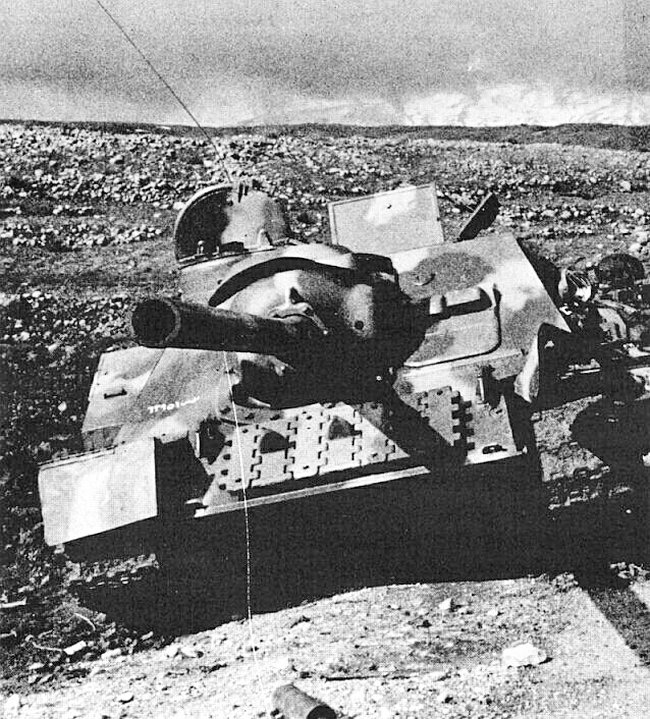 Un caccia carri pesante ‘Su100’ (di fabbricazione sovietica) utilizzato dagli egiziani nel 1948. Il mezzo risulta colpito e fuori uso.