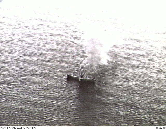 La ‘Coburg’ in affondamento (Archivio Australian War Memorial).