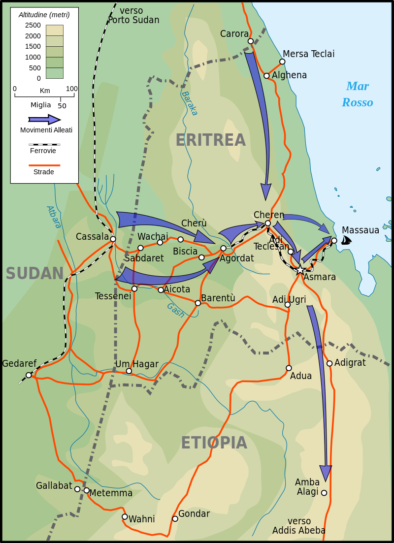 [9] Lo Scacchiere Nord, che fronteggiava il Sudan settentrionale e comprendeva i territori dei Governi dell’Eritrea (meno la Dancalia) e dell’Amara, aveva una forza di circa 102.000 uomini;
