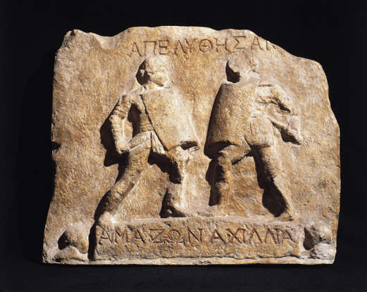 La prova più tangibile che le donne abbiano partecipato ai brutali giochi di guerra, durante la tarda Repubblica Romana e l’inizio dell’Impero, è un antico rilievo del 2° secolo, in marmo, trovato ad Alicarnasso, nell’attuale Turchia, oggi al British Museum, e riguarda le imprese di due figure femminili note come Amazzonia e Achillia, due donne che combattono con scudi, spade e protezioni per le gambe. In sostanza, una versione al femminile del ben moto eroe epico Achille, e probabilmente nome d’arte per evocare la mitologia greca. Un’iscrizione sopra le loro teste indica che hanno combattuto fino a un onorevole pareggio, in uno scontro concluso con la cosiddetta “missio”, sospensione. Le due gladiatrici, con armature pesanti e “subligaculum” (attrezzatura standard dei gladiatori), sarebbero appartenute alla categoria “provocatrices”, e sono a seno nudo, come si raffigura nell’amazzonomachia). Nel 1996, gli archeologi del Museo di Londra hanno scoperto frammenti di un osso pelvico femminile carbonizzato, rinvenuti fra le ceneri cremate di un’elaborata tomba di epoca romana, nel quartiere londinese di Southwark. Venne da subito proposta l’ipotesi di una sepoltura di una gladiatrice, basata sugli oggetti decorativi e sui resti di un sontuoso banchetto, che occupavano la tomba. Fra questi, lampade a olio raffiguranti scene di combattimento gladiatorio e un gladiatore che cade. Un’altra opera d’arte che si dice raffiguri una gladiatrice, è la statua di bronzo di 2000 anni fa conservata al Museum für Kunst und Gewerbein di Amburgo, in Germania. La figura solleva una spada corta e ricurva, la cosiddetta “sica”, in segno di trionfo. La figura è poi a torso nudo, come i gladiatori tipicamente combattevano. Se questo pezzo rappresentasse davvero una gladiatrice, sarebbe la seconda raffigurazione di cui si abbia notizia.