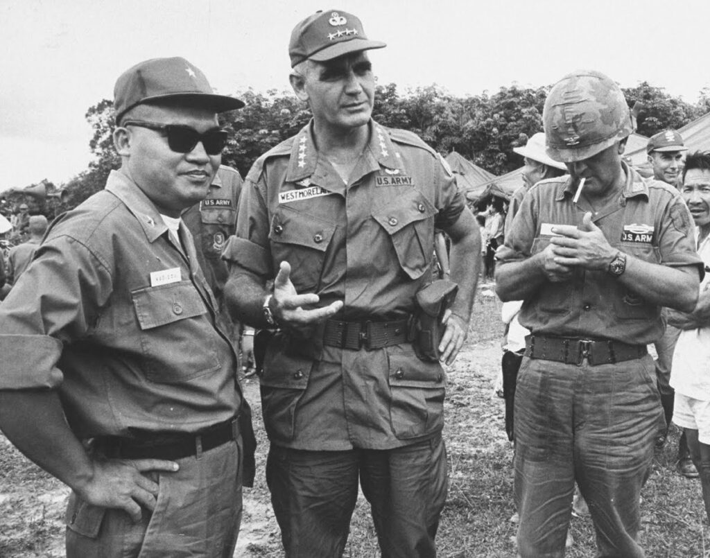 Elicotteri e soldati americani in Vietnam. Nella foto sopra il generale Westmoreland.