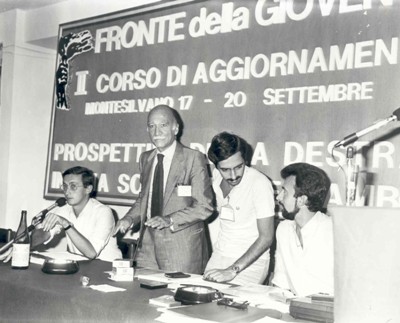 Da sinistra: Gianfranco Fini, Giorgio Almirante, Maurizio Gasparri, Almerigo Grilz (Montesilvano, 1981).