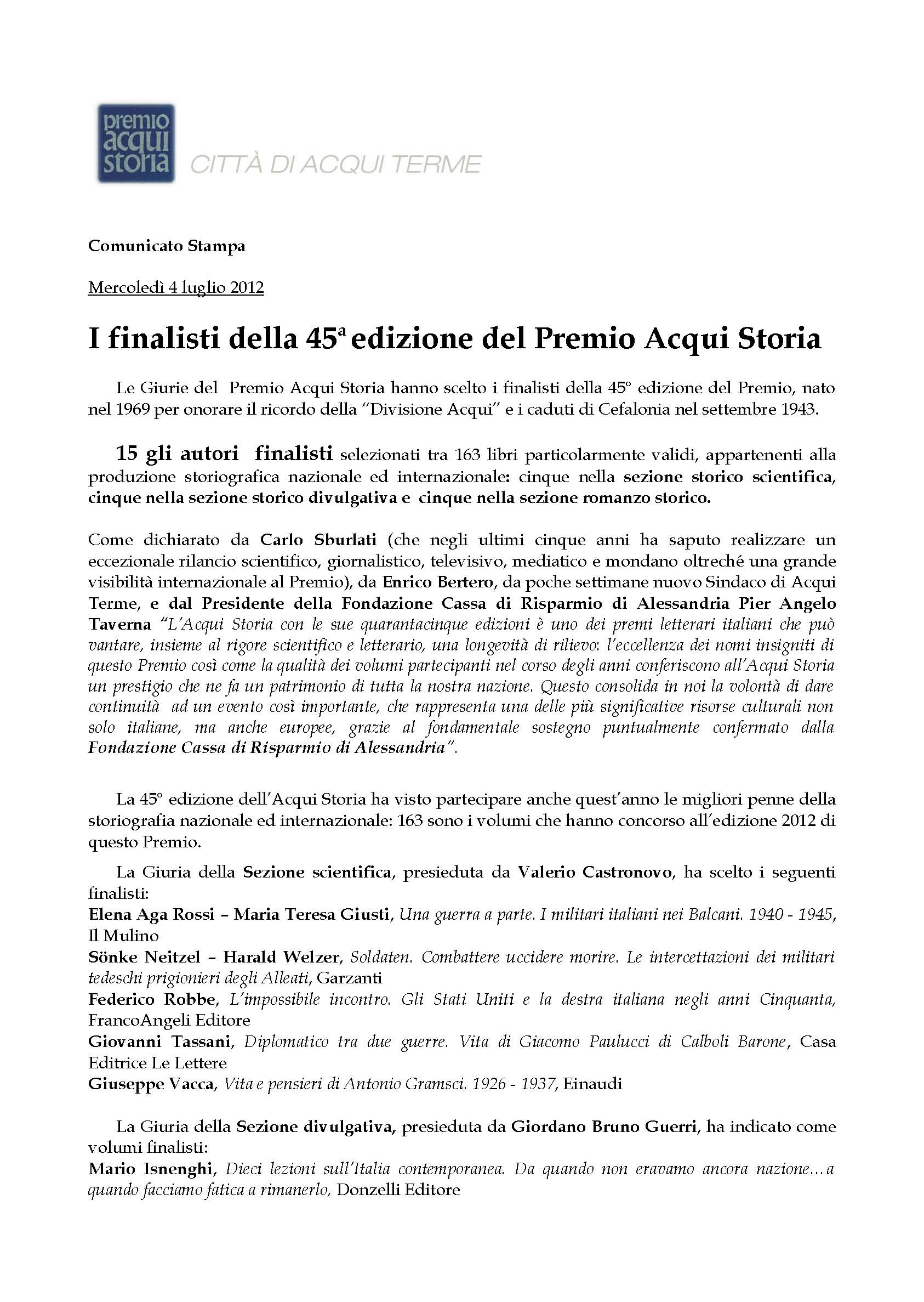 Comunicato stampa: finalisti Premio Acqui Storia 2012. 45ma edizione